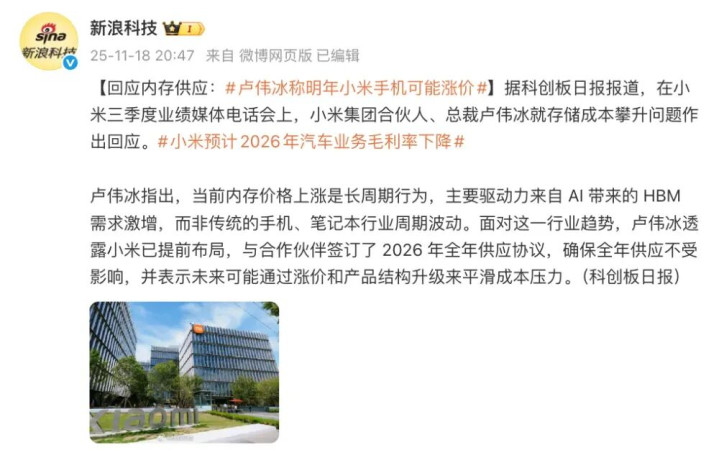 据悉,小米集归拢伴东谈主、总裁卢伟冰曾提到过,面临这一改行趋势,小米已提前布局,与协作伙伴坚忍了 2026 年全年供应契约,确保全年供应不受影响,并暗示改日可能通过加价和居品结构升级来平滑资本压力。