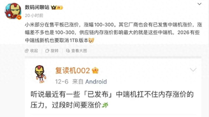小米部分在售平板已加价,涨幅100-300。其它厂商也会有已发售中端机加价,涨幅差未几亦然100-300,供应链内存加价影响最大的就是这些中端机,2026有些中端线新机也要取消1TB版块。